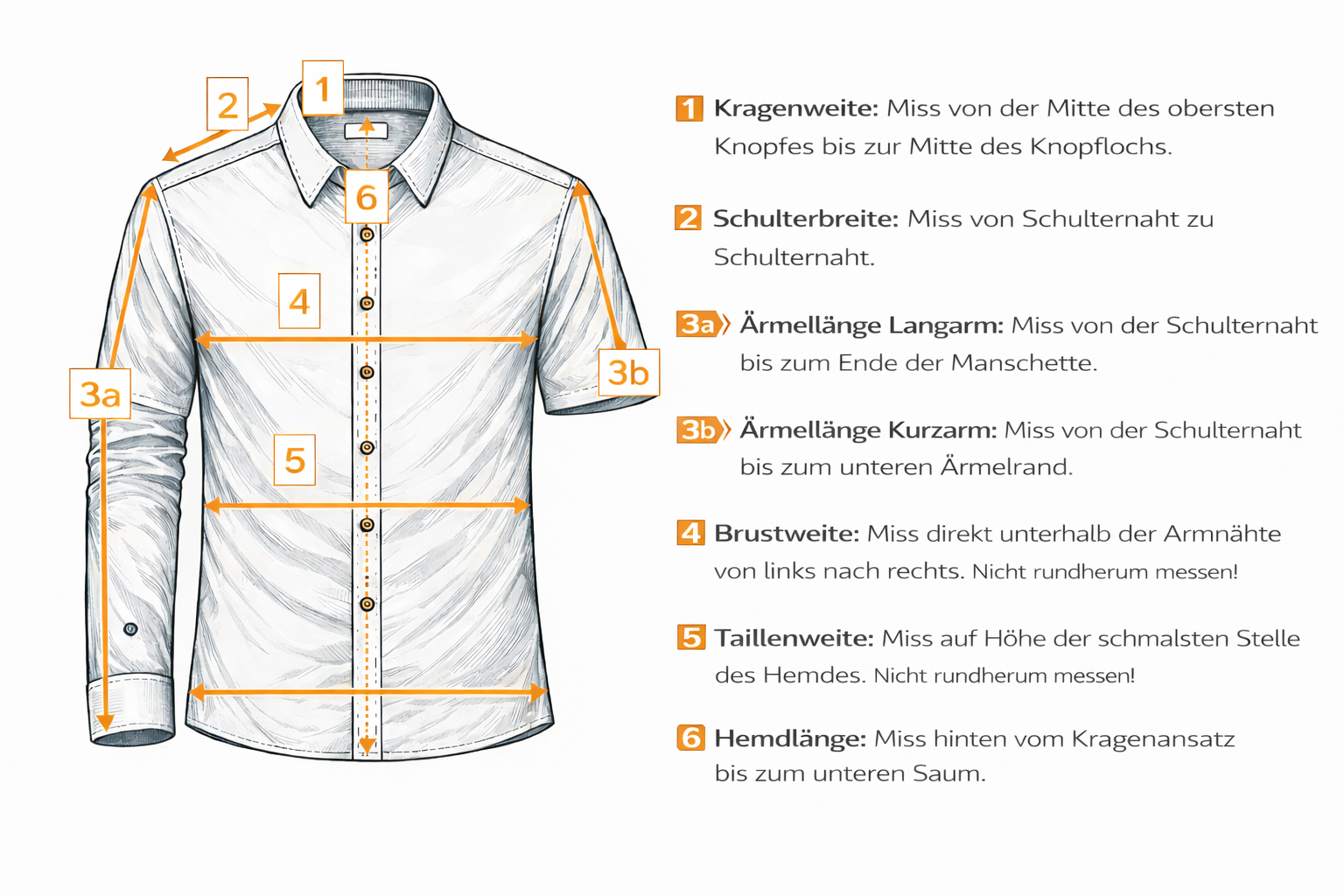 Im letzten Schritt brauchen wir noch deine Maße. Nimm bitte dein Lieblingshemd zur Hand und teile uns dessen Abmessungen mit – so können wir sicherstellen, dass dein neues Hemd perfekt passt. Die Anleitung dazu findest du nachstehend.